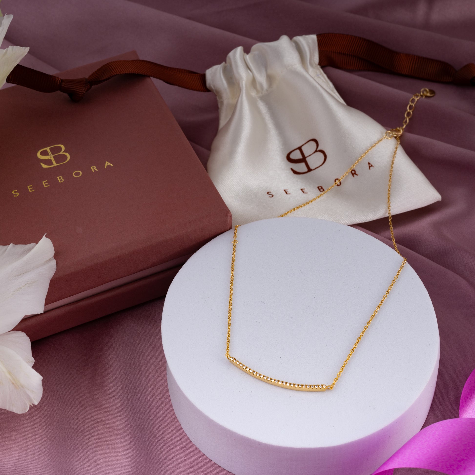 This exquisite chain necklace features a curved line pendant, luminously adorned with cubic zirconium stones.
