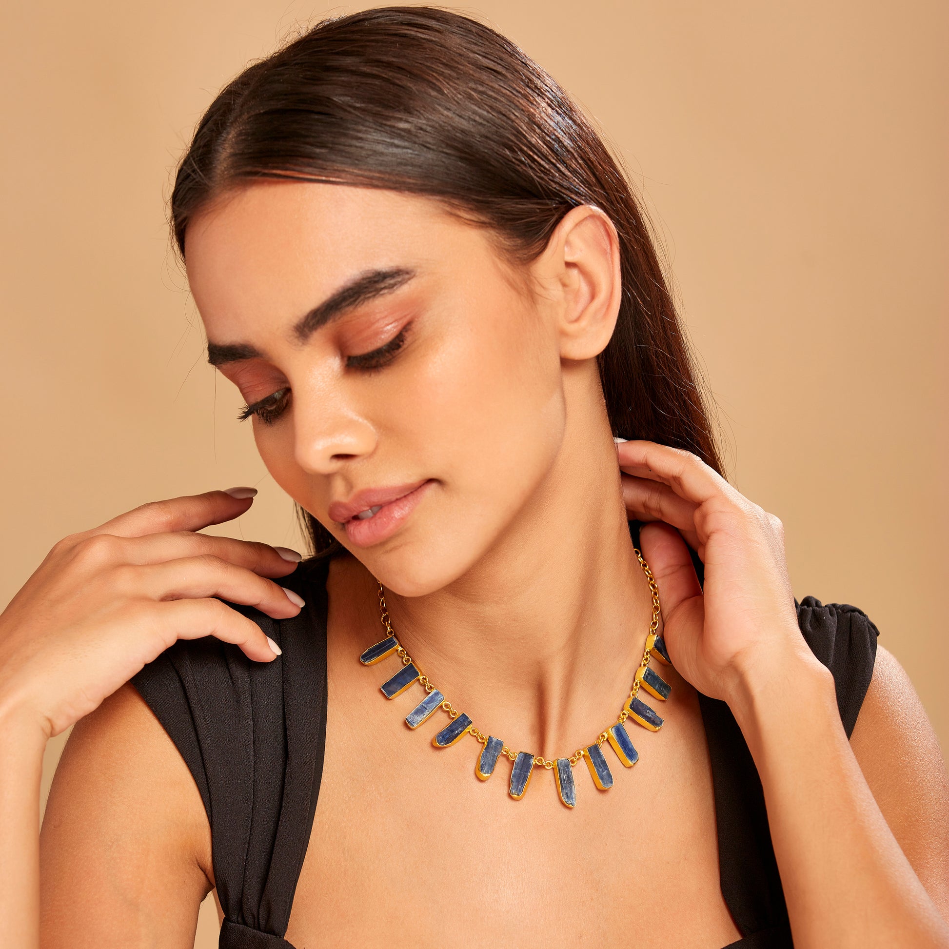 A statement necklace featuring oblong kyanite stones carved in their natural form.