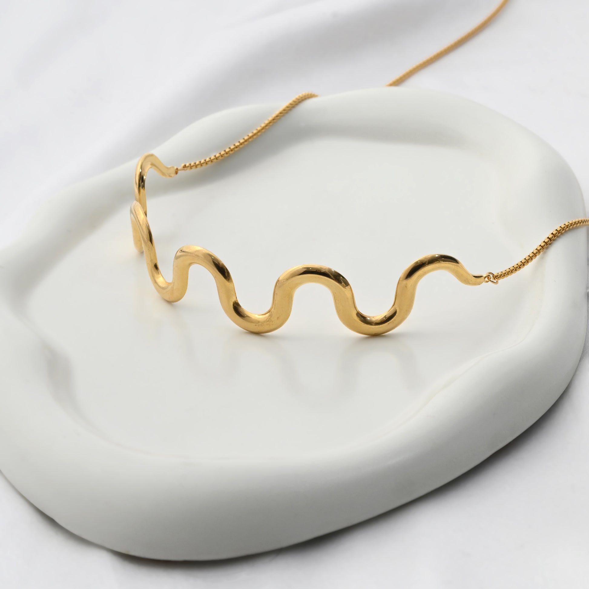 Elevate your style with this stunning gold choker, featuring a unique wave design that beautifully complements any outfit. Crafted with precision, this piece adds a touch of elegance and sophistication, making it perfect for both casual and formal occasions.