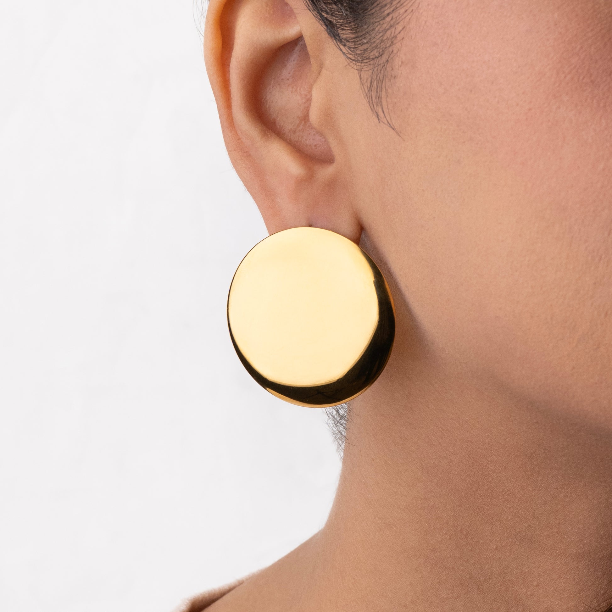 Elevate your accessory collection with these exquisite gold disc earrings, designed to add a touch of elegance to any outfit. Crafted from high-quality materials, these earrings feature a sleek and modern disc shape that catches the light beautifully, making them a perfect choice for both casual and formal occasions.