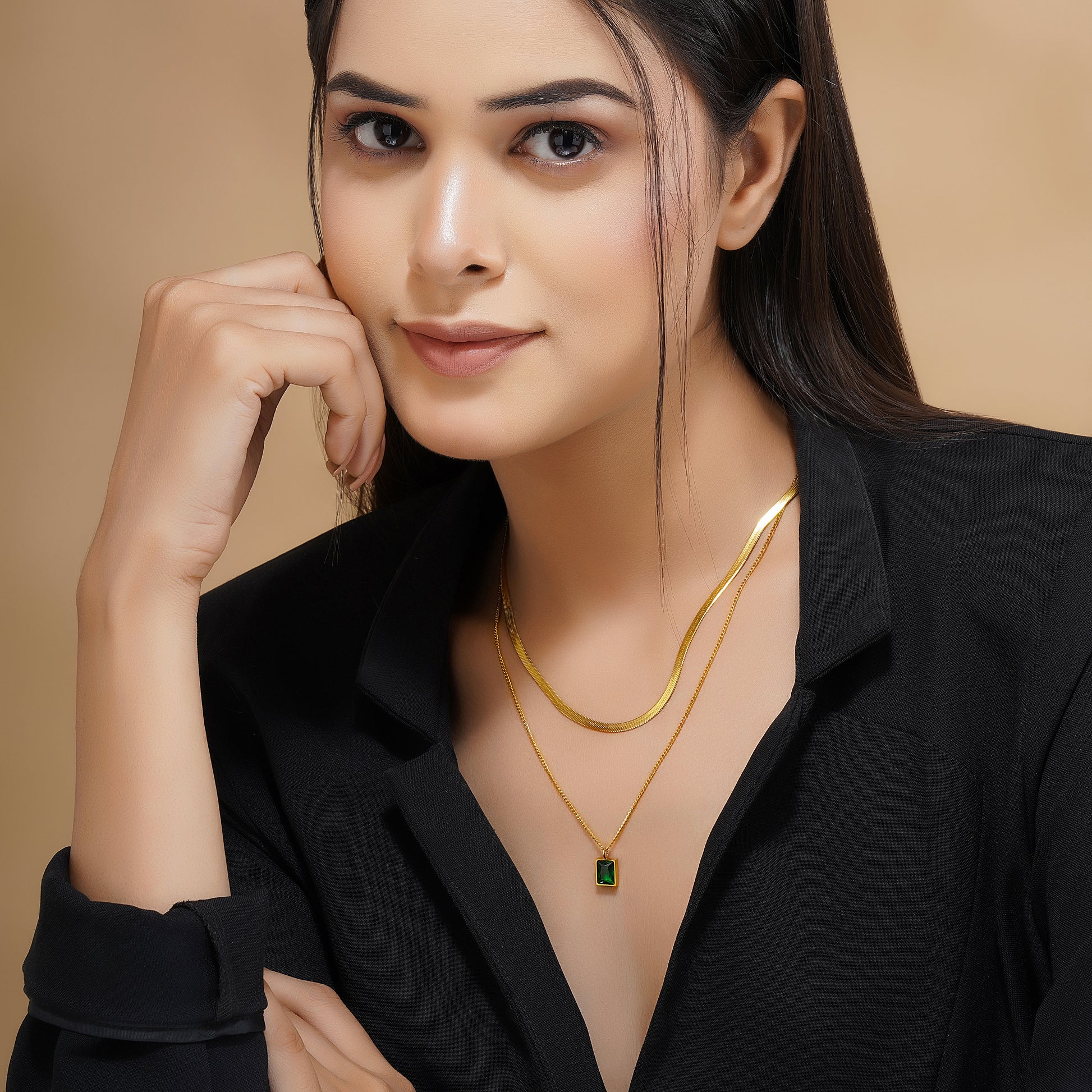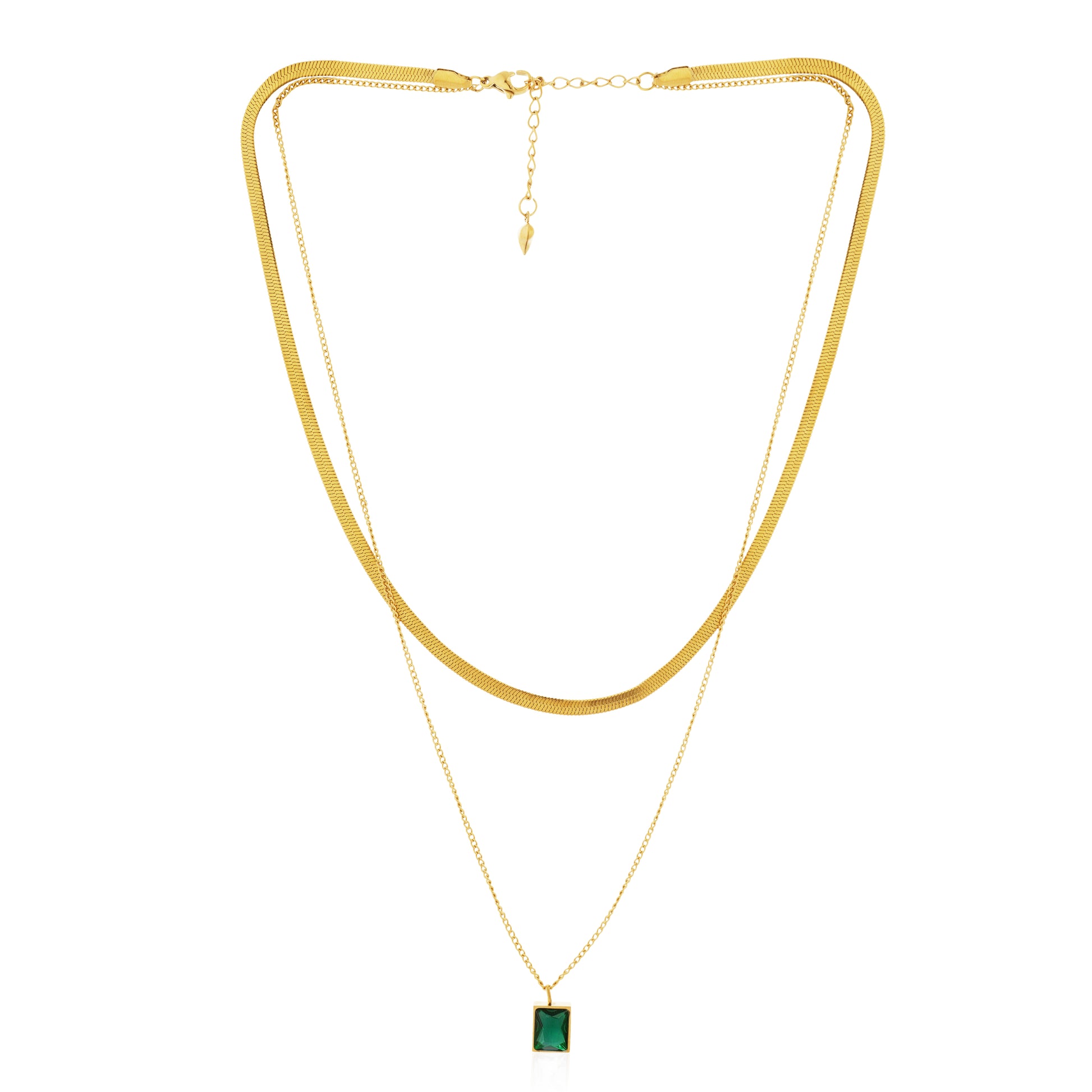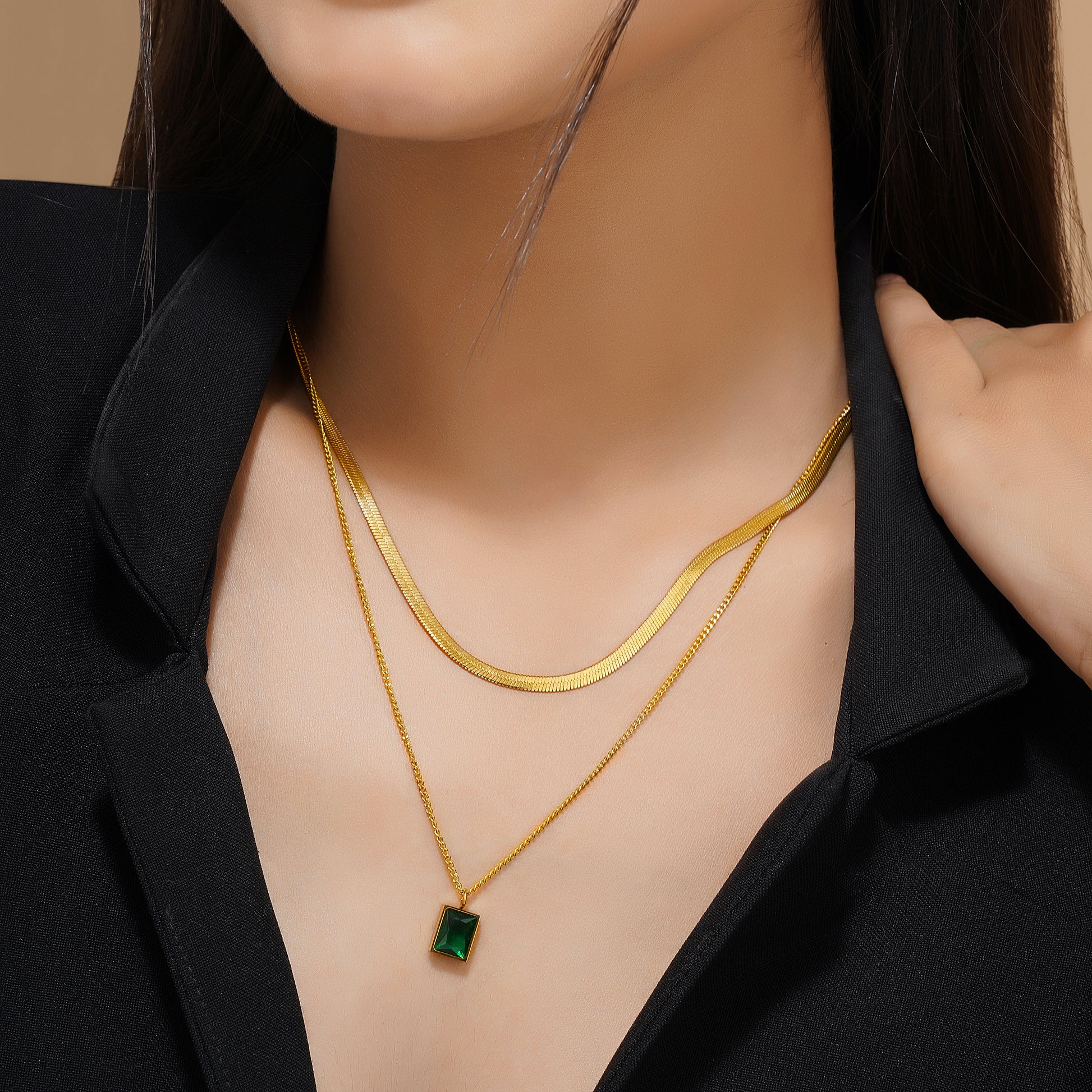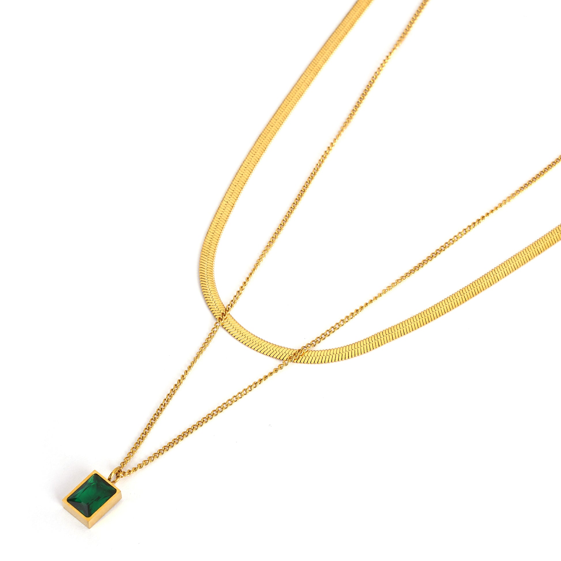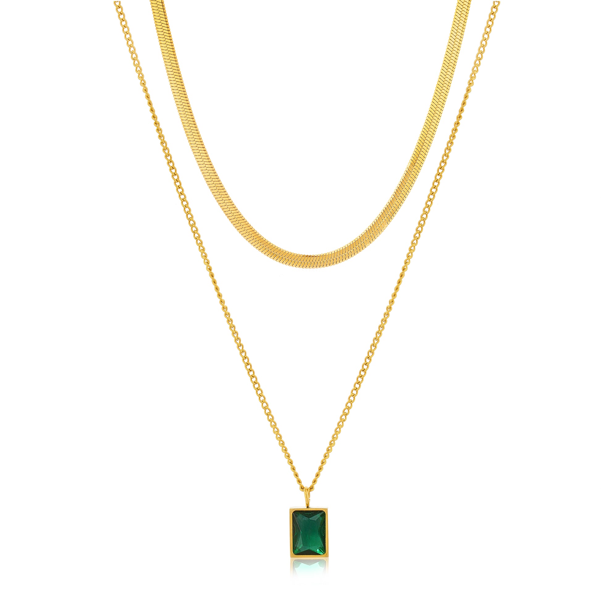 Experience the stunning beauty and elegance of the stainless steel emerald twin chain necklace, accented with 24K gold plating and adorned with sparkling cubic zirconia. Elevate your style and make a statement with this luxurious piece of jewelry.