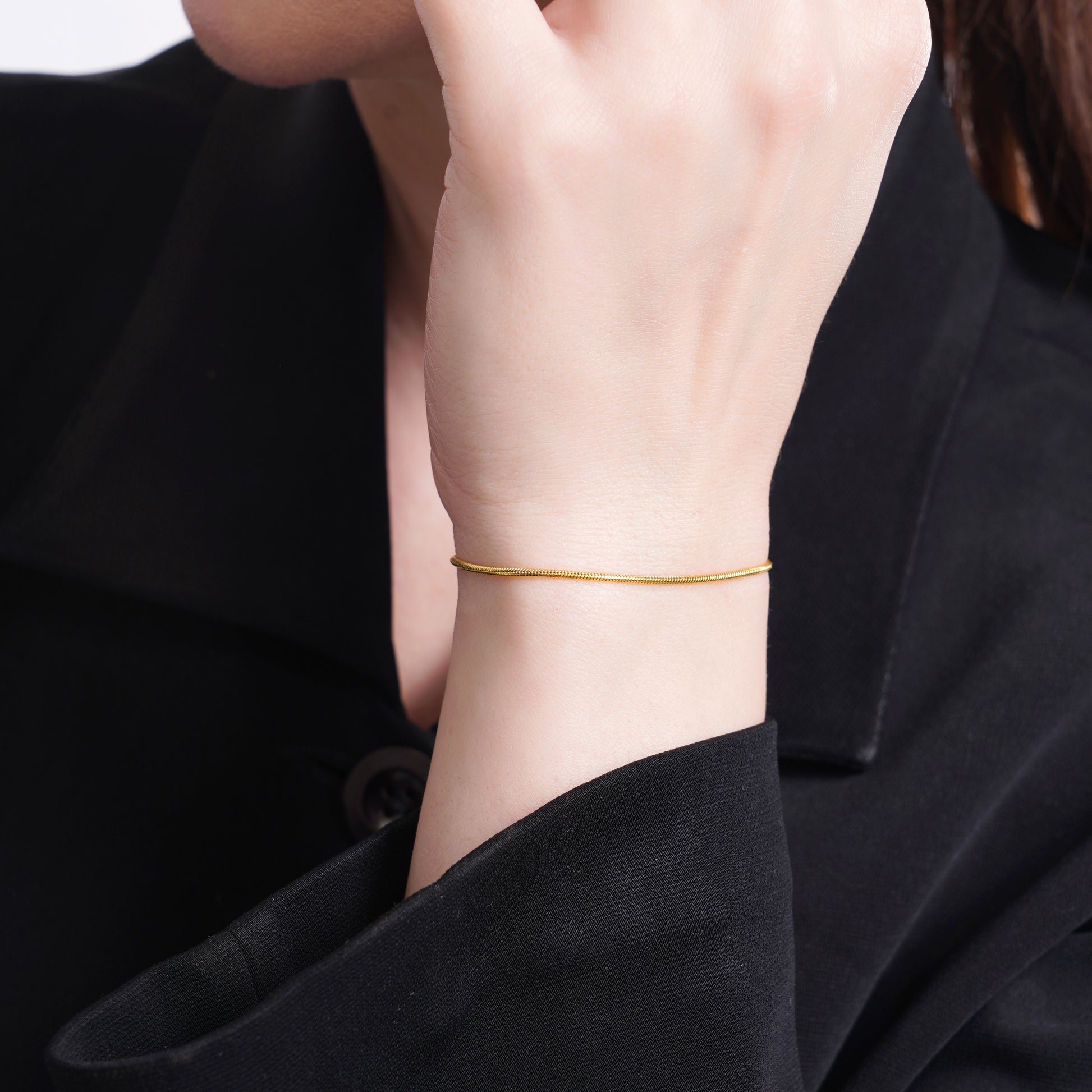 This elegant gold snake chain bracelet is a must-have for any jewelry collection. Crafted from high-quality materials, this bracelet is both durable and stylish. The smooth, slinky snake chain design is comfortable to wear and adds a touch of sophistication to any outfit.