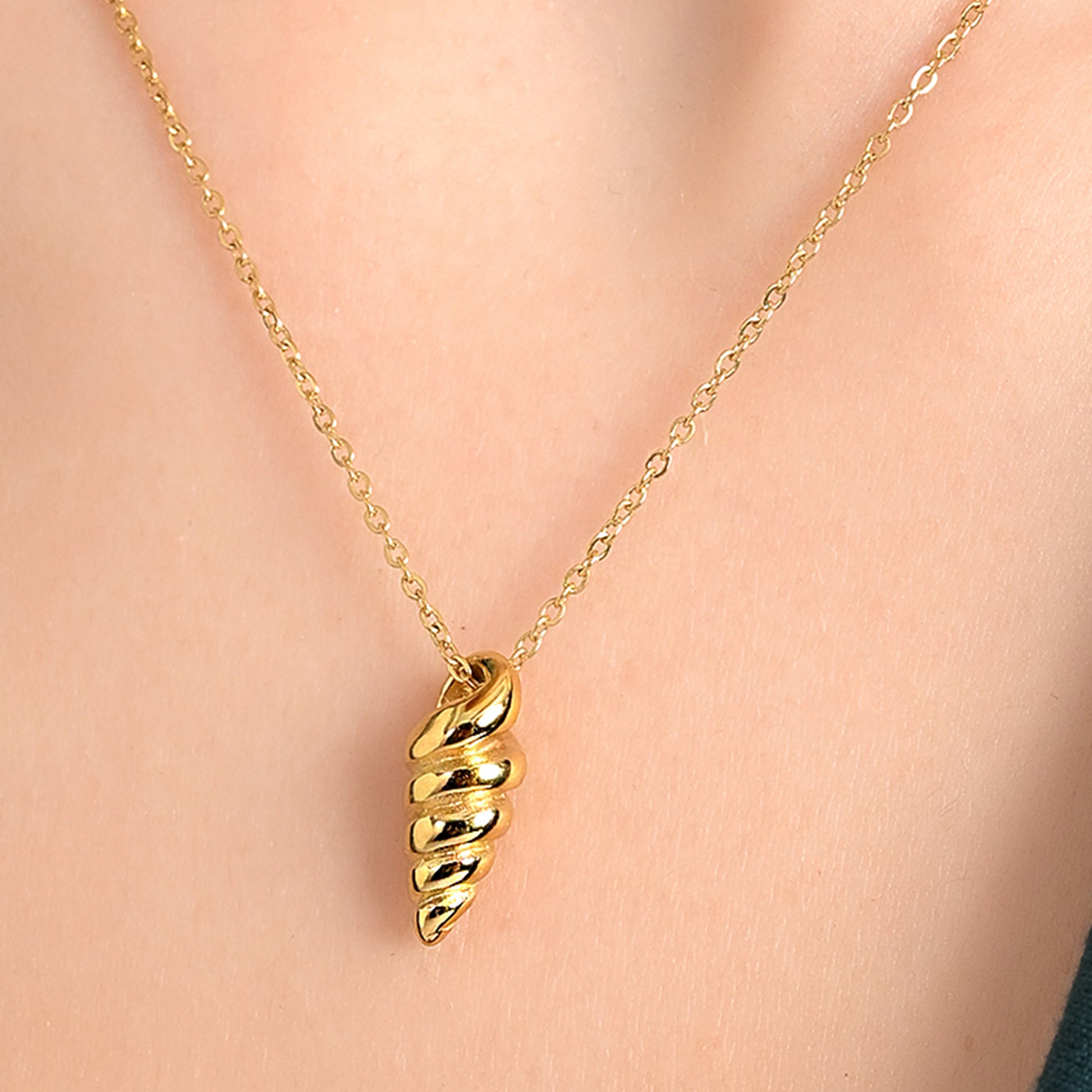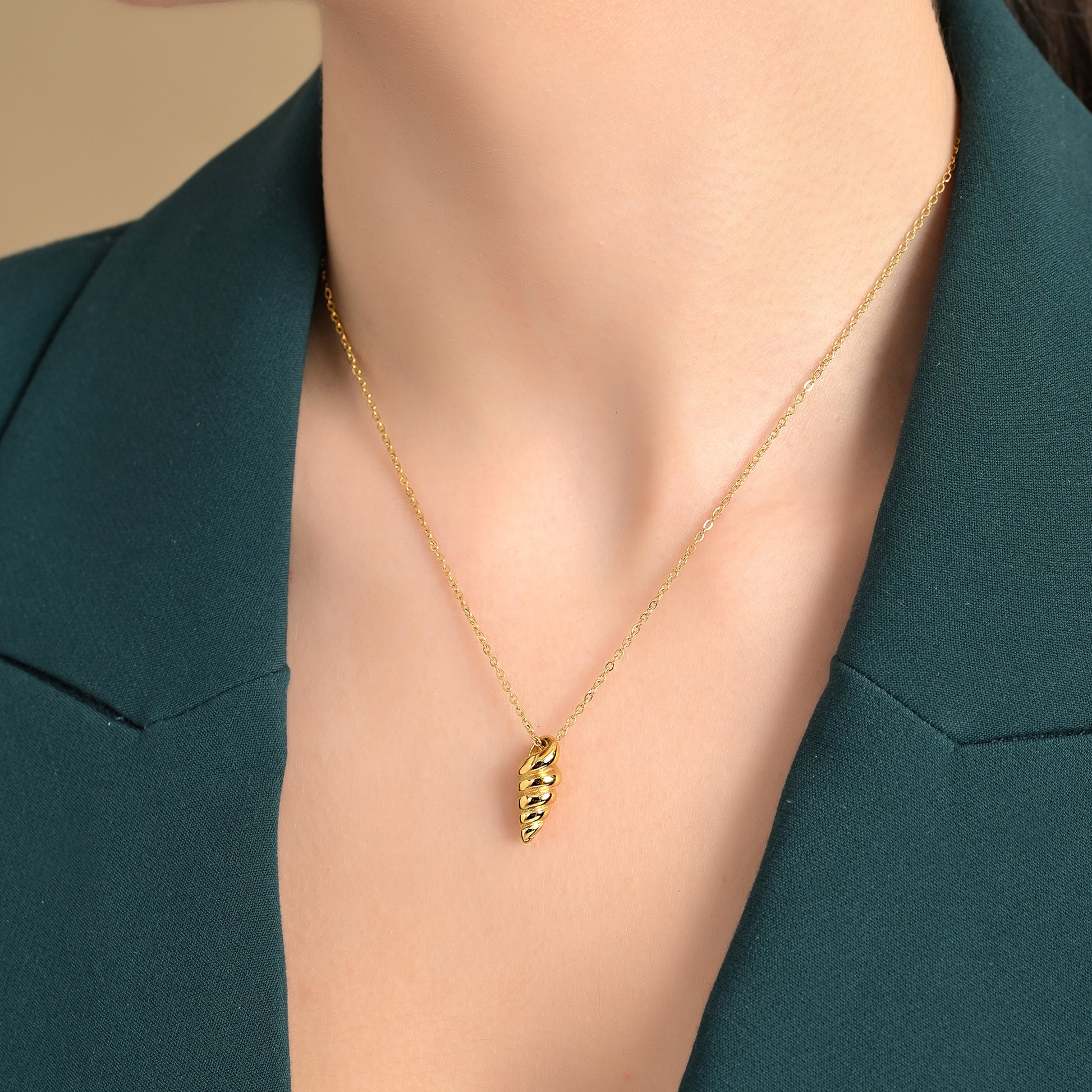This stunning necklace features a unique spiral design that beautifully complements any outfit. Crafted with precision, it adds a touch of elegance and sophistication, making it perfect for both casual and formal occasions. The warm hue of the gold enhances the wearer's natural beauty, drawing attention to the neckline.