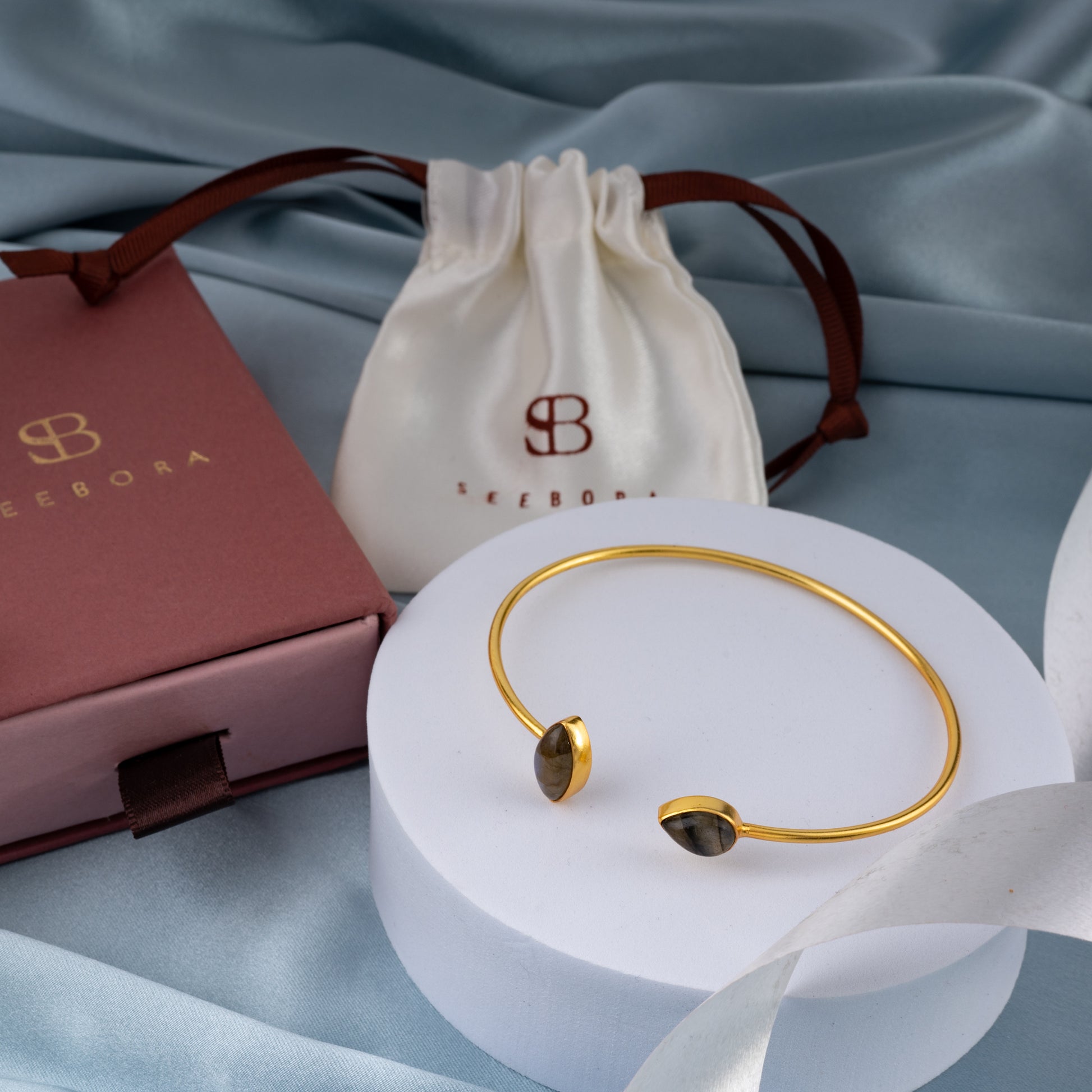 This bold bracelet commands attention - perfect for the risk-taker. Featuring 18k gold plating and labradorite stones for a look that works no matter the occasion. Make a statement every day!