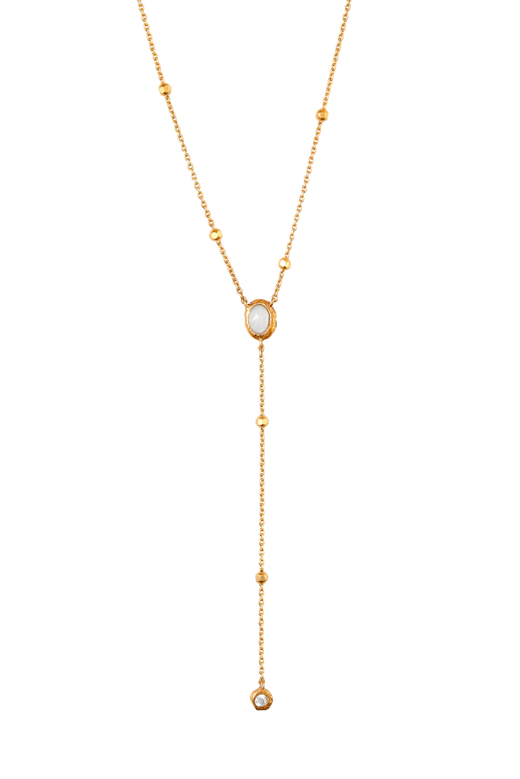 A minimalist necklace of sparsely dispersed gold beads, featuring a main moonstone in the centre, intricately connected to a smaller moonstone via a demi-lune chain.