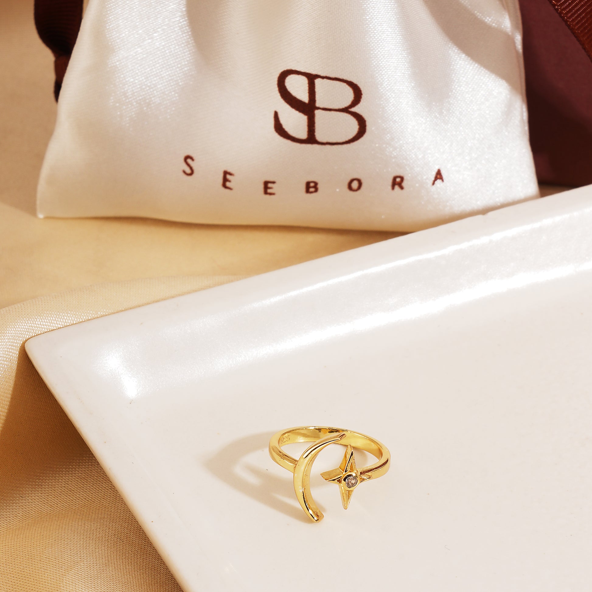 This adjustable ring features a four-sided star on one end, decorated with a moonstone in its center and a crescent moon on the other.