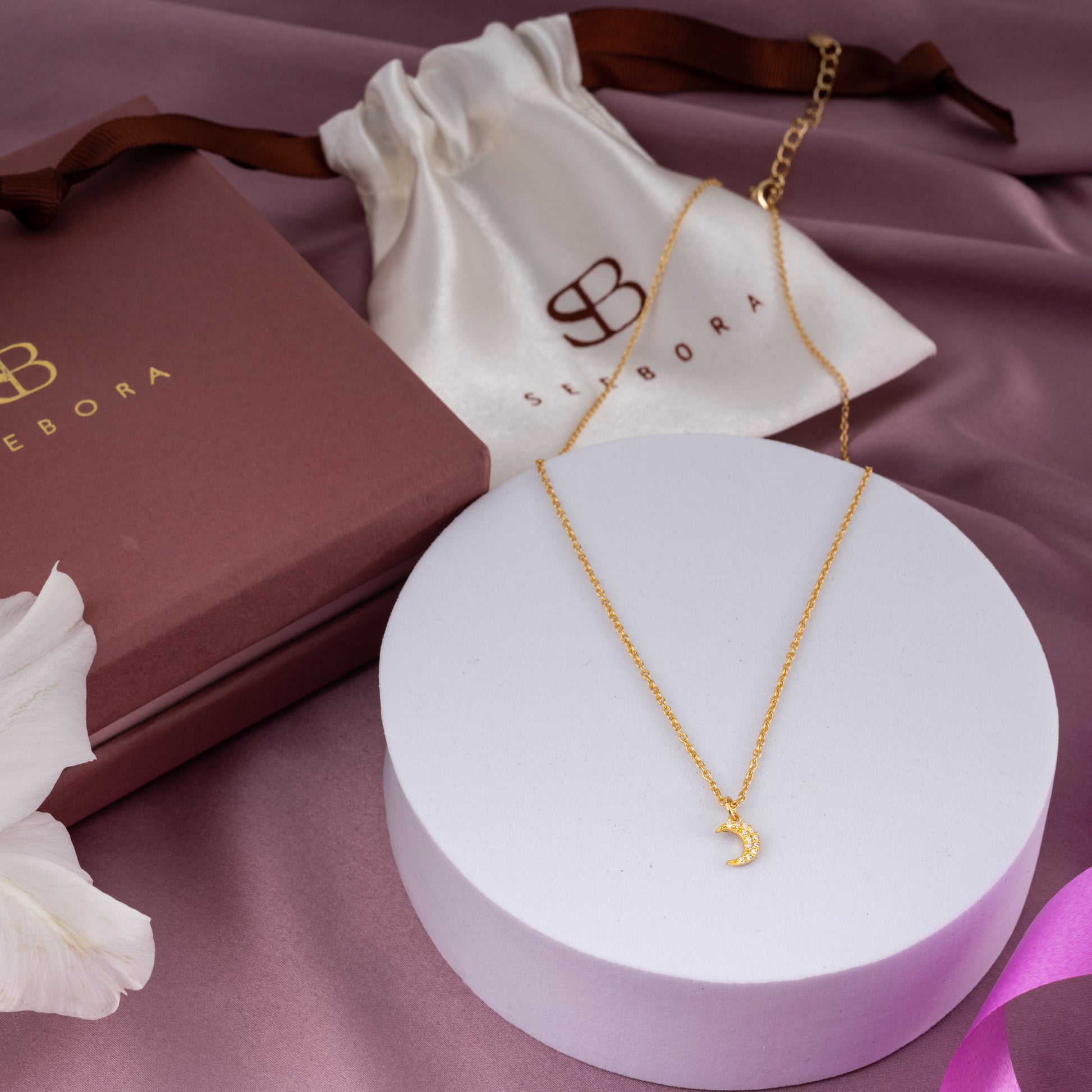 This chain necklace features a stunning crescent moon pendant embellished with dazzling cubic zirconia gemstones.