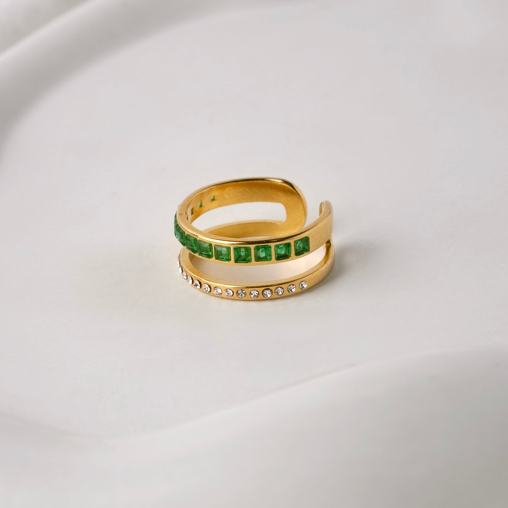 This exquisite two-tone stone ring features a stunning design that elegantly combines gold with vibrant green and pristine white stones. The harmonious blend of colors creates a striking visual appeal, making it a perfect accessory for both casual and formal occasions.